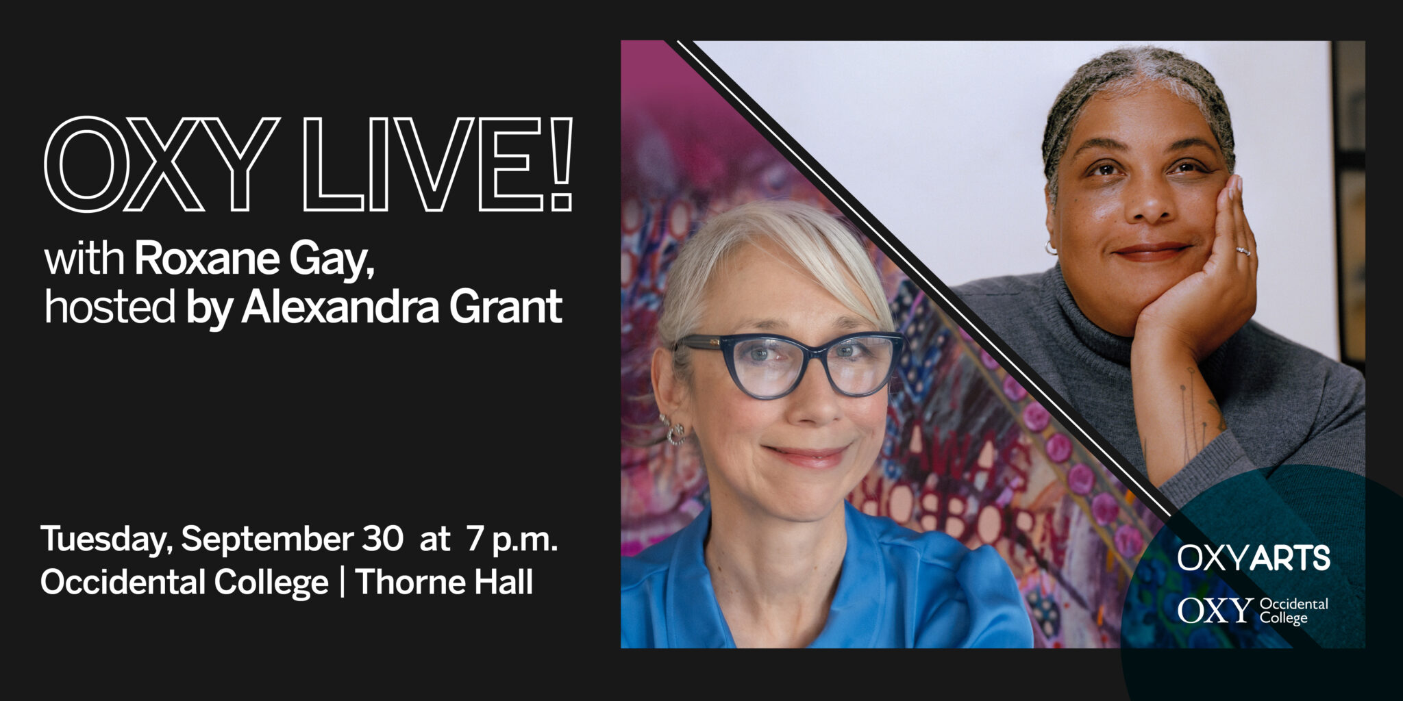 Starting this fall, Alexandra Grant will be the new host of Oxy Live! at Occidental College. The first conversation, on September 30, will be with bestselling author and feminist icon Roxane Gay.